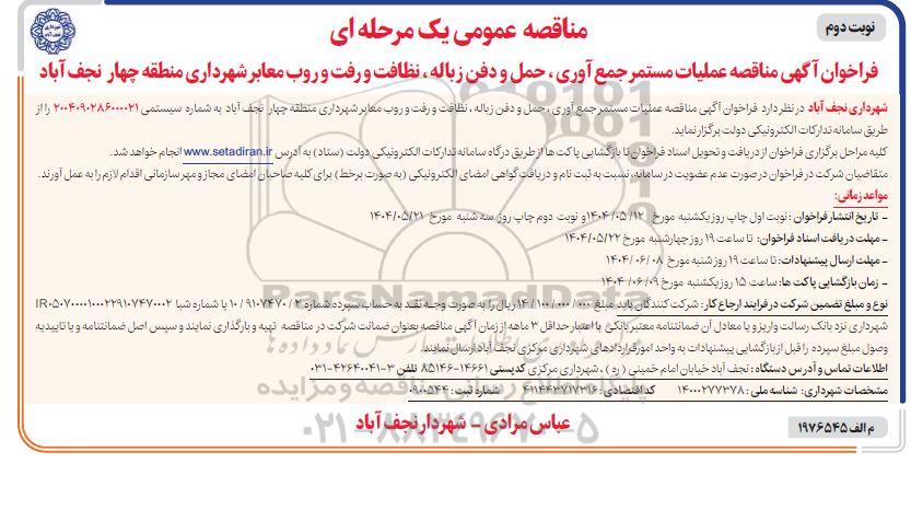 فراخوان آگهی مناقصه عملیات مستمر جمع آوری، حمل و دفن زباله ، نظافت و رفت و روب معابر شهرداری منطقه چهار نجف آباد