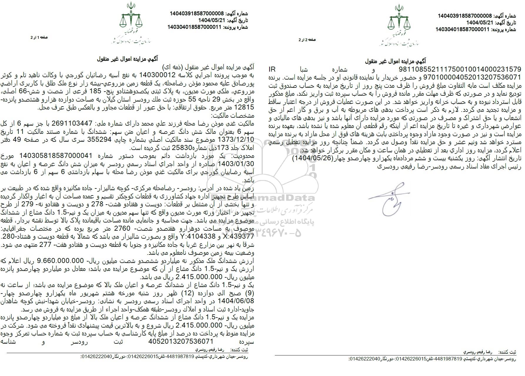 مزایده فروش یک قطعه زمین مزروعی - بیشه زار به مبلغ 9.660.000.000 ریال