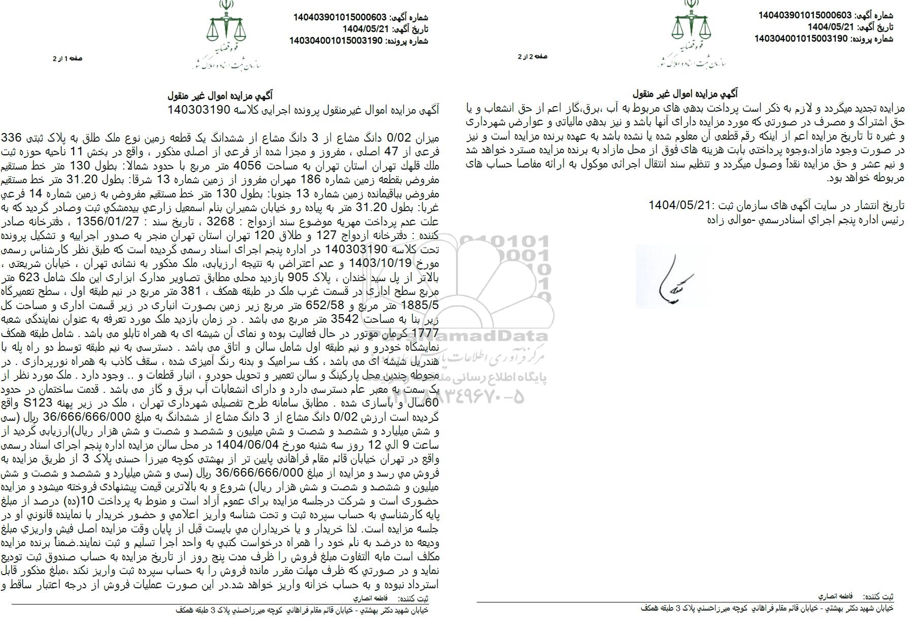مزایده میزان 0.02 دانگ مشاع از 3 دانگ از ششدانگ زمین کلاسه 140303190