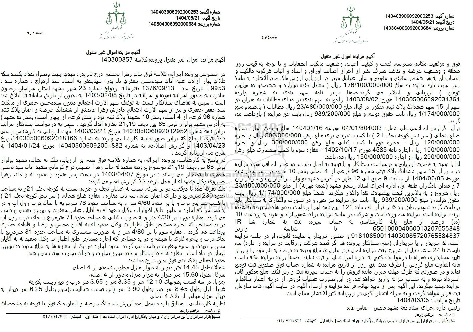 مزایده ملک به مساحت 230 مترمربع و اعیان شامل سه باب مغازه پلاک ثبتی شماره 96 فرعی از 4 اصلی