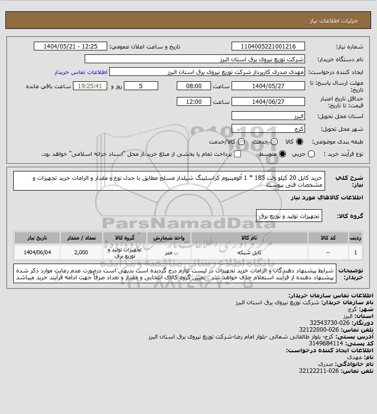 شرح کلی نیاز: خرید کابل 20 کیلو ولت 185 * 1 آلومینیوم کراسلینگ شیلدار مسلح مطابق با جدل نوع و مقدار و الزامات خرید تجهیزات و مشخصات فنی پیوست