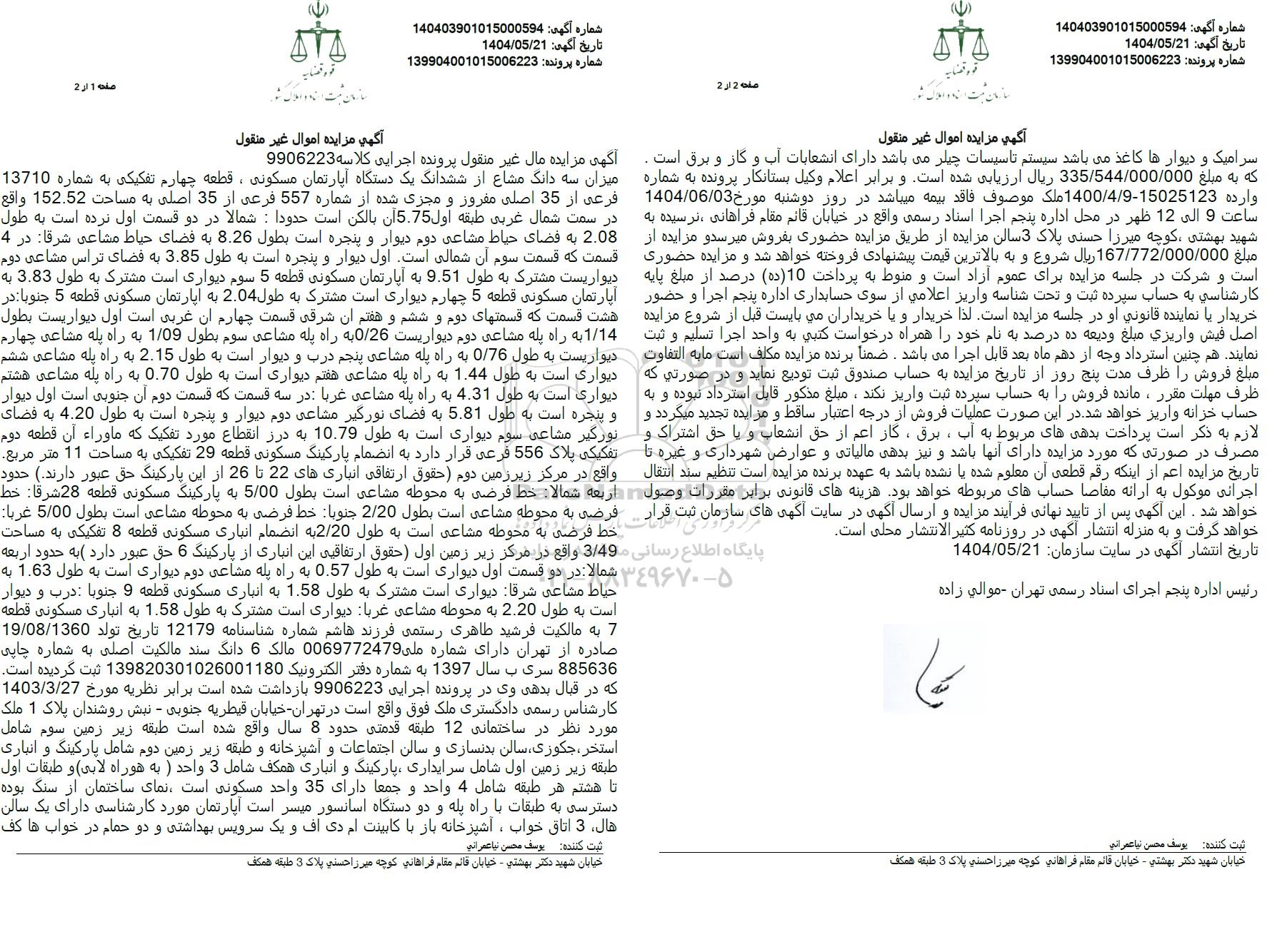 مزایده فروش یک دستگاه آپارتمان مسکونی به مساحت 152.52 مترمربع به پلاک ثبی 557 فرعی از 35 اصلی