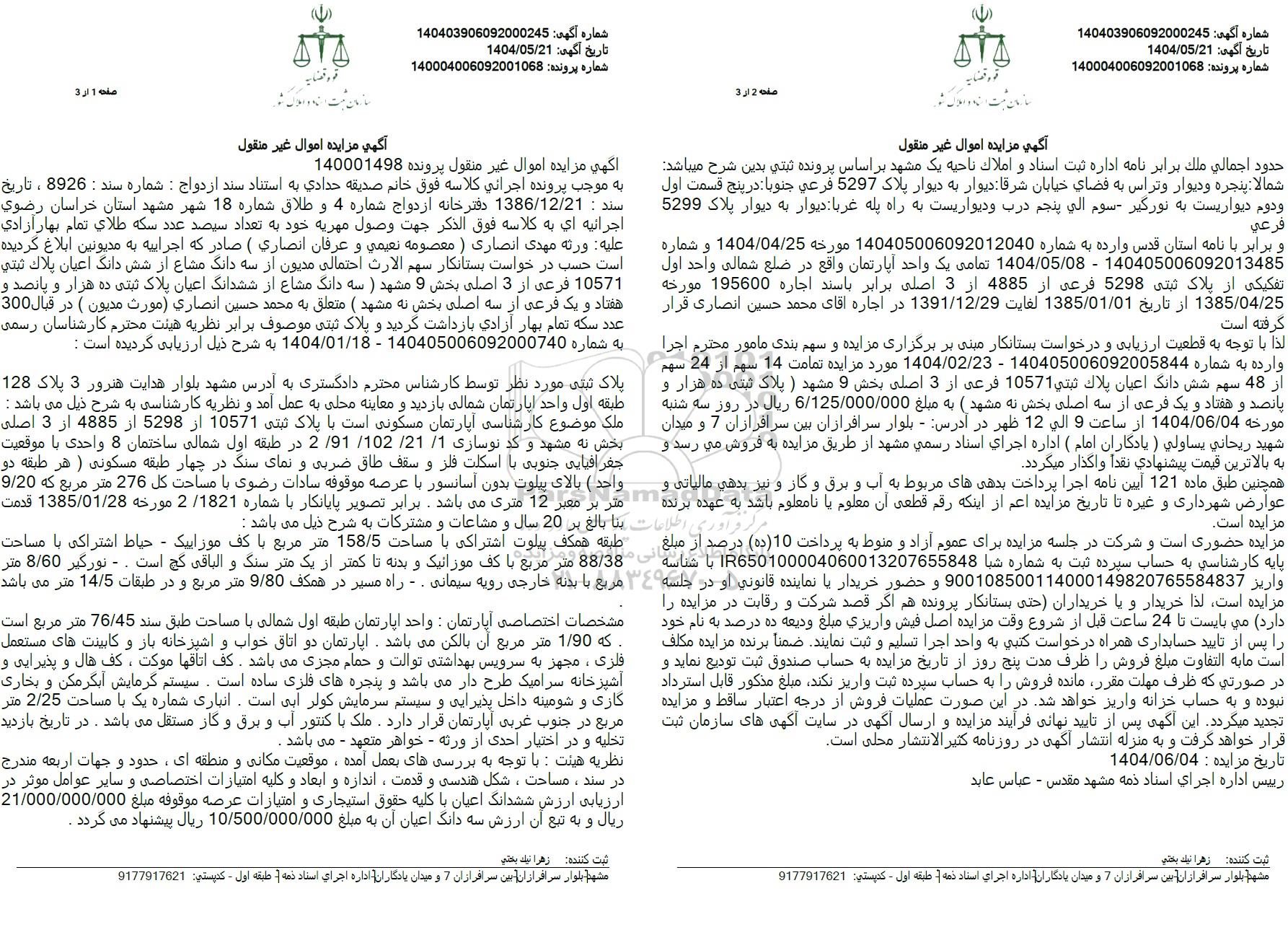 مزایده عمومی مزایده سه دانگ مشاع از ششدانگ اعیان پلاک ثبتی 10571 فرعی برگزار میگردد. از کلیه افراد متخصص و شرکتهای واجد شرایط دعوت به عمل میآید تا در این مزایده با کد خبرگزاری پارس نماد : 9399456 شرکت نمایند تاریخ شروع مزایده : 1404/05/21 مهلت شرکت در مزایده: تا پایان روز 1404/06/04 مکان برگزاری اموال واگذاری استانهای خراسان رضوی و دستهبندیهای مربوط به این حراجی املاک و زمین میباشد.