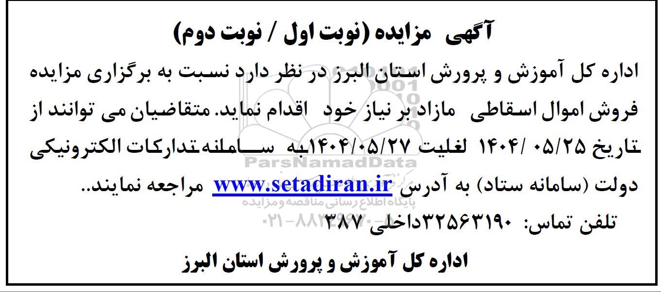 اداره کل آموزش و پرورش استان البرز در نظر دارد نسبت به برگزاری مزایده فروش اموال اسقاطی مازاد برنیاز خود اقدام نماید. متقاضیان می توانند از تاریخ 1404.5.25 لغایت 1404.5.27 به سامانه تدارکات الکترونیک دولت (سامانه ستاد) به آدرس ستاد ایران مراجعه نمایند.