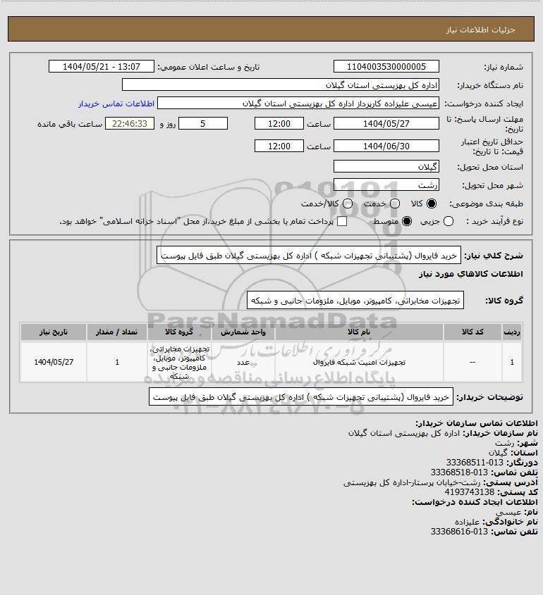 | 1 | -- | تجهیزات امنیت شبکه فایروال | عدد | تجهیزات مخابراتی، کامپیوتر، موبایل، ملزومات جانبی و شبکه | 1 | 1404/05/27 |