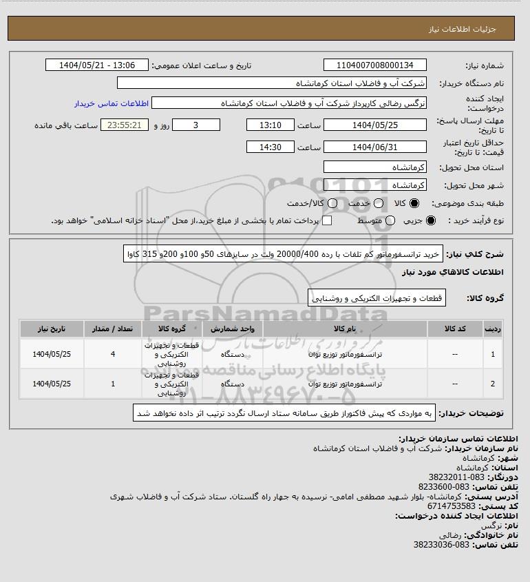 شرح کلی نیاز: خرید ترانسفورماتور کم تلفات با رده 20000/400 ولت در سایزهای 50و 100و 200و 315 کاوا