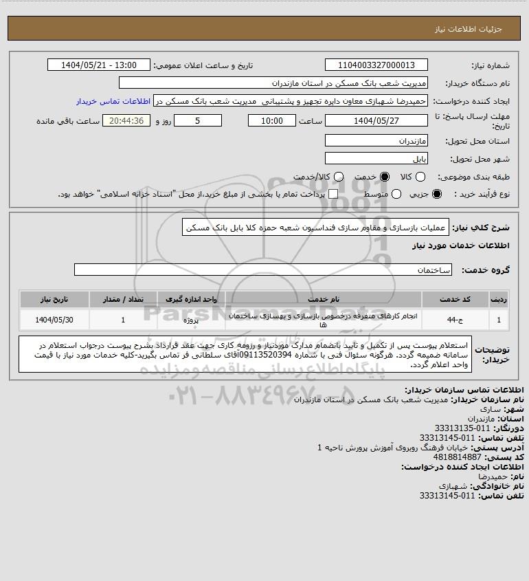 شرح کلی نیاز: عملیات بازسازی و مقاوم سازی فنداسیون شعبه حمزه کلا بابل بانک مسکن