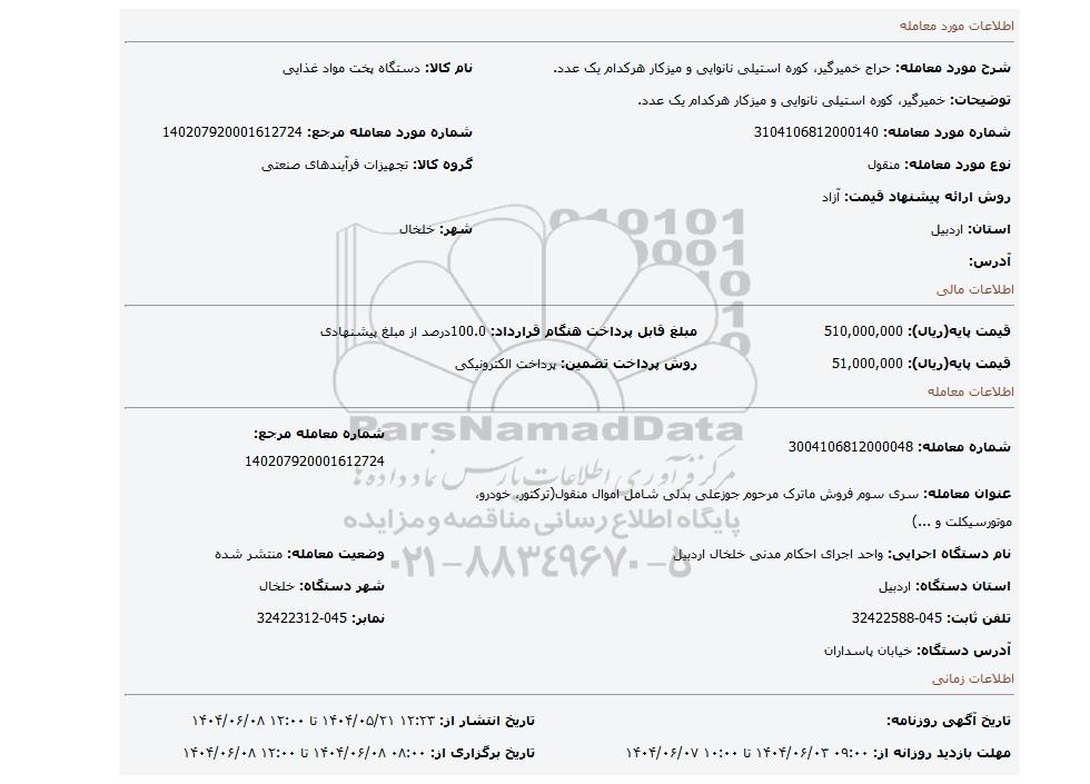 | نام دستگاه اجرایی: واحد اجرای احکام مدنی خلخال اردبیل | وضعیت معامله: منتشر شده | |