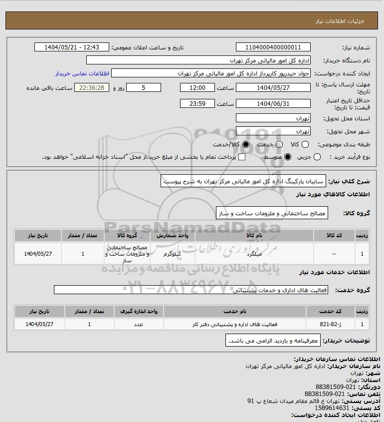 شرح کلی نیاز: سایبان پارکینگ اداره کل امور مالیاتی مرکز تهران به شرح پیوست
