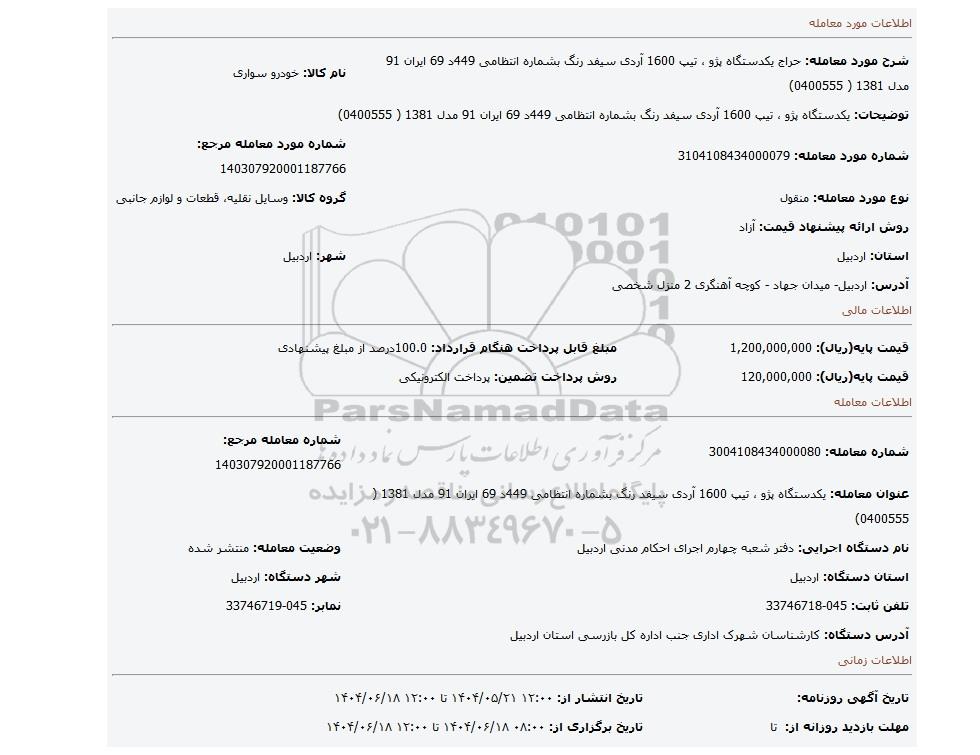 مزایده یکدستگاه پژو تیپ 1600 آردی سیفد رنگ بشماره انتظامی 449د 69 ایران 91 مدل 1381 ( 0400555), مزایده، یکدستگاه پژو ، تیپ 1600 آردی سیفد رنگ بشماره انتظامی 449د 69 ایران 91 مدل 1381 ( 0400555)