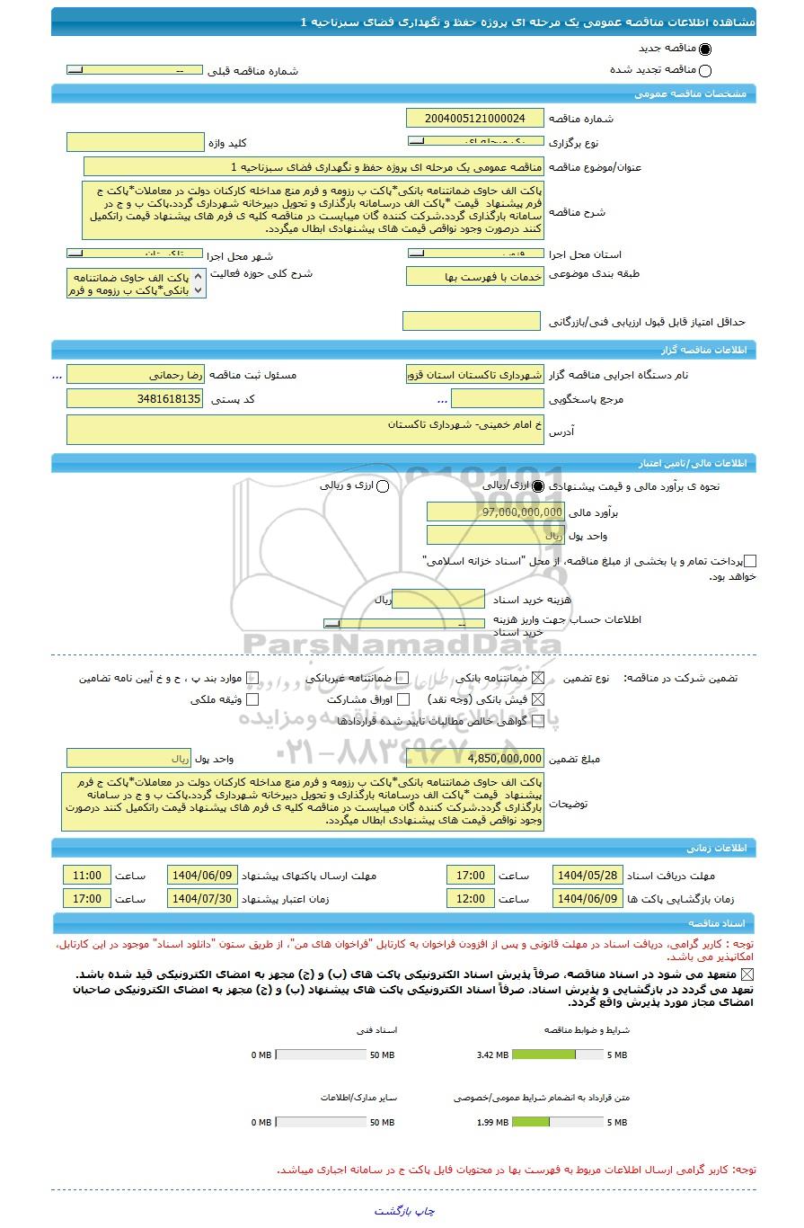 | نام دستگاه اجرایی مناقصه گزار | شهرداری تاکستان استان قزوین | مسئول ثبت مناقصه | رضا رحمانی |