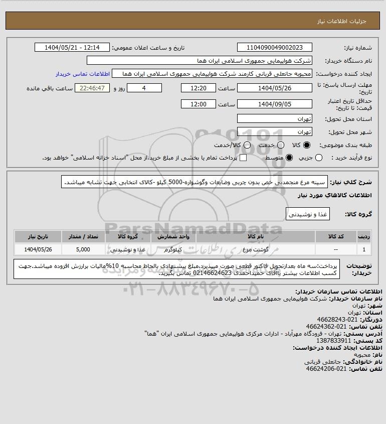 شرح کلی نیاز: سینه مرغ منجمدبی خص بدون چربی وضایعات وگوشواره-5000 کیلو -کالای انتخابی جهت تشابه میباشد.