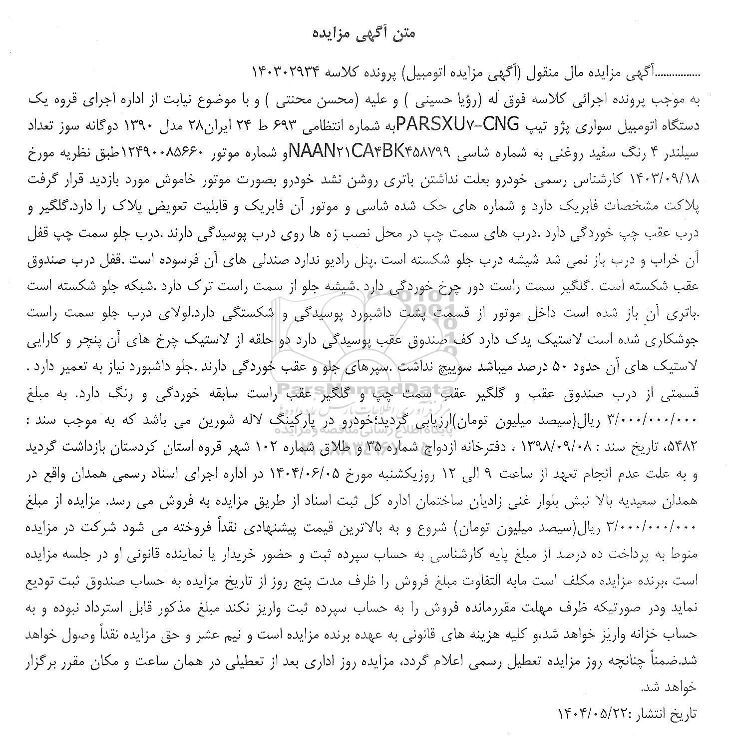 مزایده فروش یکدستگاه اتومبیل سواری پژو تیپ PARSXU7-CNG دوگانه سوز مدل 1390 به مبلغ 3.000.000.000 ریال
