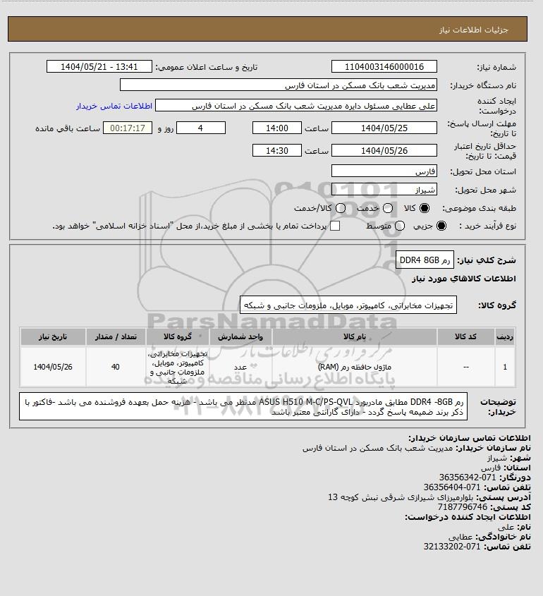 | 1 | -- | ماژول حافظه رم (RAM) | عدد | تجهیزات مخابراتی، کامپیوتر، موبایل، ملزومات جانبی و شبکه | 40 | 1404/05/26 |
