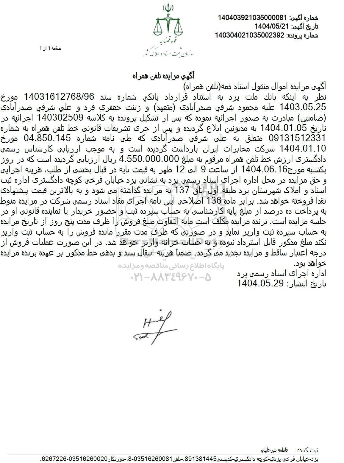 مزایده فروش خط تلفن همراه به شماره 09131512331 به ارزش 4.550.000.000 ریال