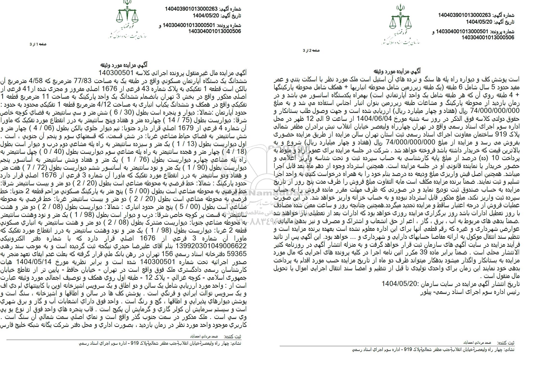 تاریخ مزایده روز سه شنبه مورخ 1404.06.04 از ساعت 9 اصلی 12 ظهر در محل اداره سوم اجرای اسناد رسمی واقع در تهران چهارراه ولیعصر خیابان انقلاب نبش برادران مظفر شمالی پلاک 919