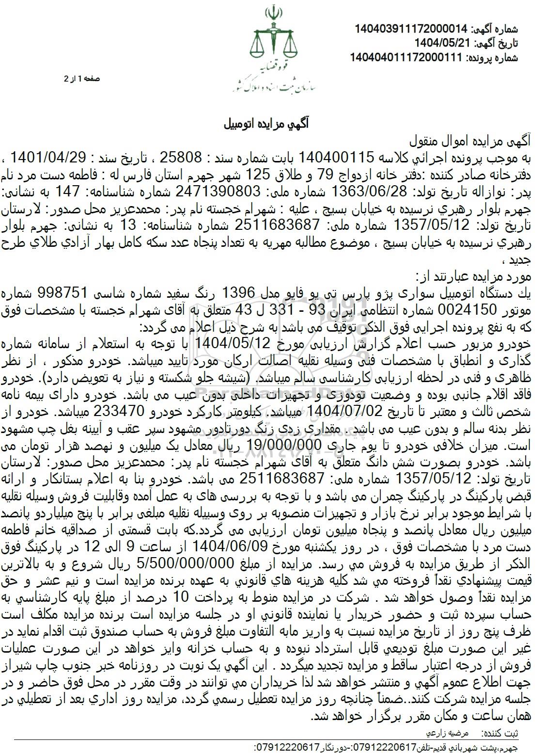 مزایده یک دستگاه اتومبیل سواری پژو تی یو فایو کلاسه 140400115