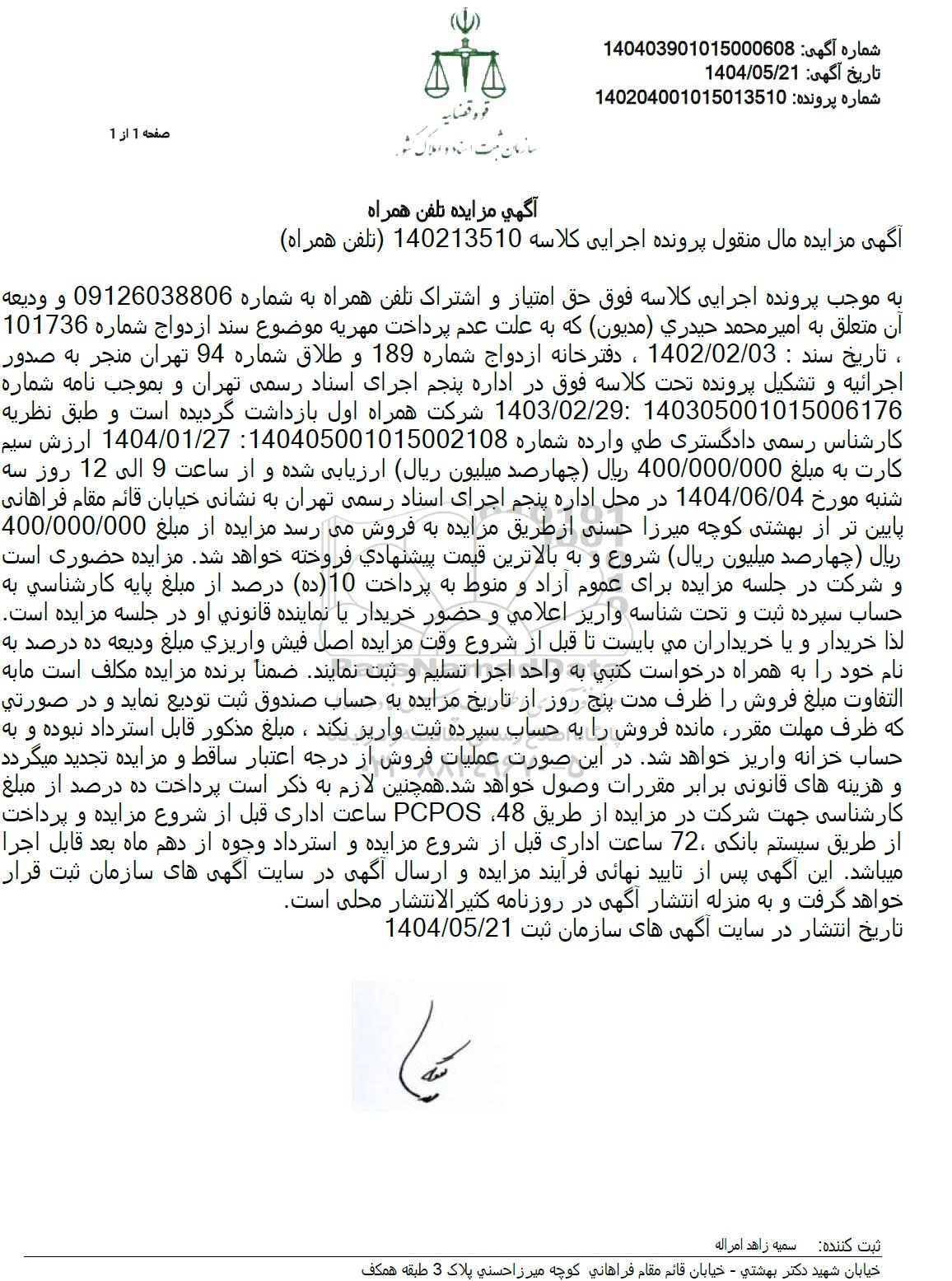 مزایده حق امتیاز و اشتراک تلفن همراه با شماره 09126038806 کلاسه 140213510