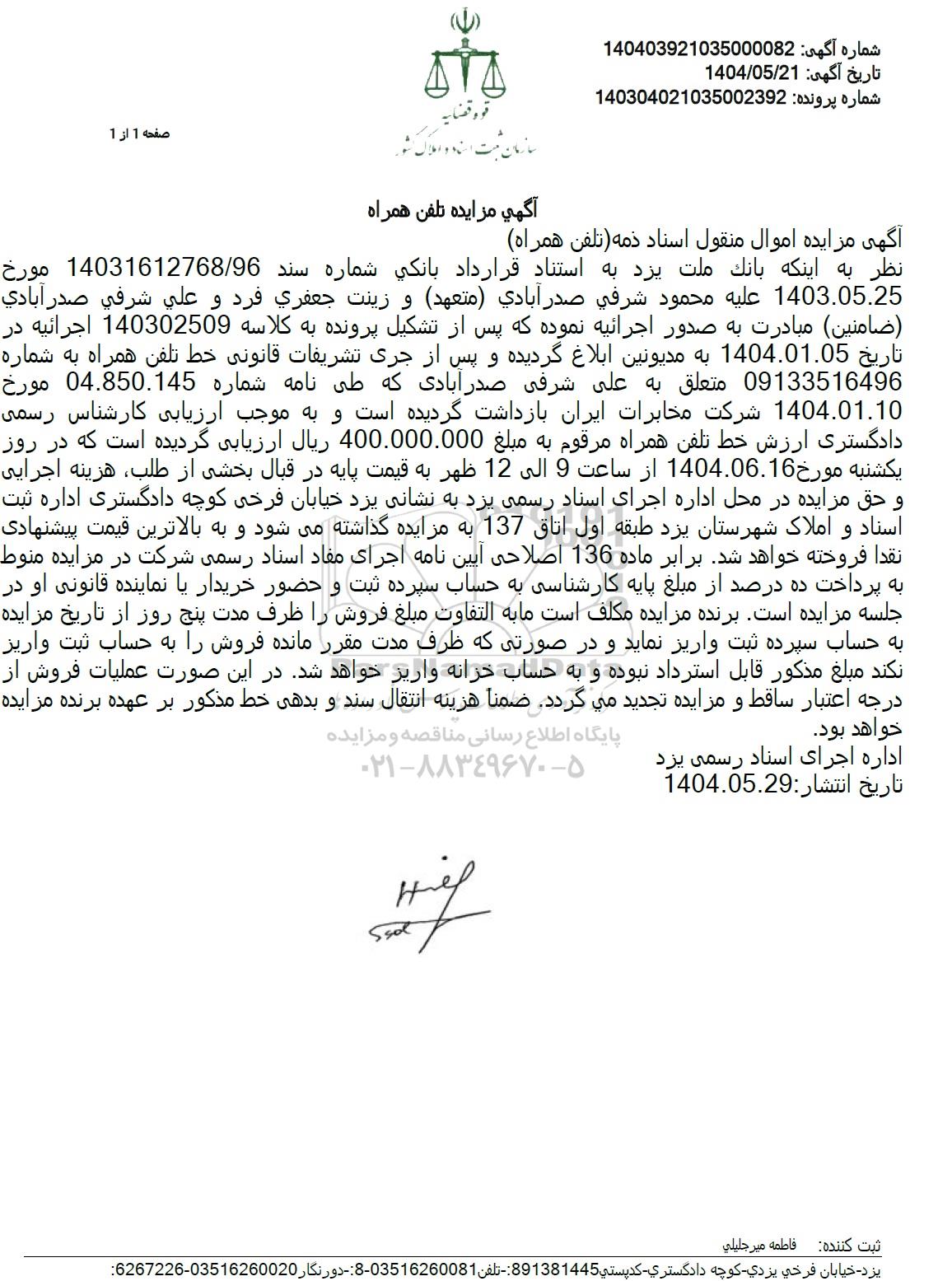 مزایده فروش خط تلفن همراه به شماره 09133516496 به ارزش 400.000.000 ریال