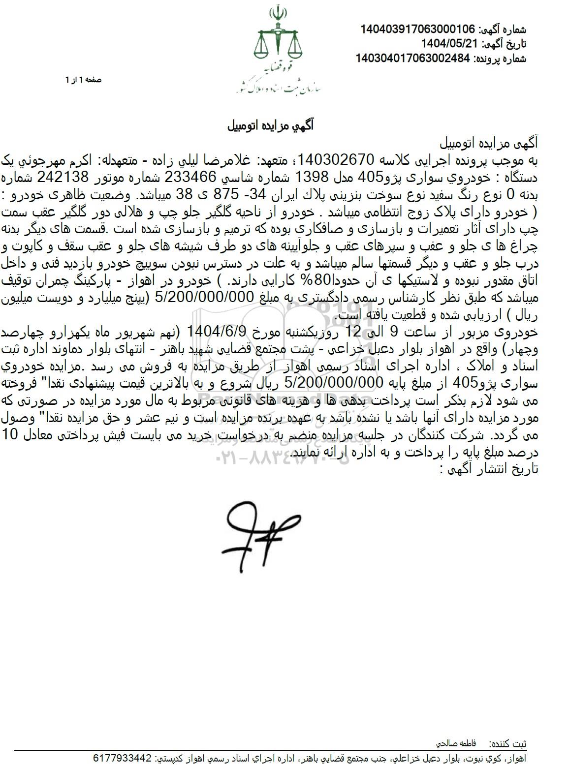 مزایده عمومی مزایده فروش خودرو پژو 405 مدل 1398 برگزار میگردد. از کلیه افراد متخصص و شرکتهای واجد شرایط دعوت به عمل میآید تا در این مزایده با کد خبرگزاری پارس نماد : 9400476 شرکت نمایند تاریخ شروع مزایده : 1404/05/21 مهلت شرکت در مزایده: تا پایان روز 1404/06/09 مکان برگزاری اموال واگذاری استانهای خوزستان و دستهبندیهای مربوط به این حراجی انواع خودرو سبک میباشد.