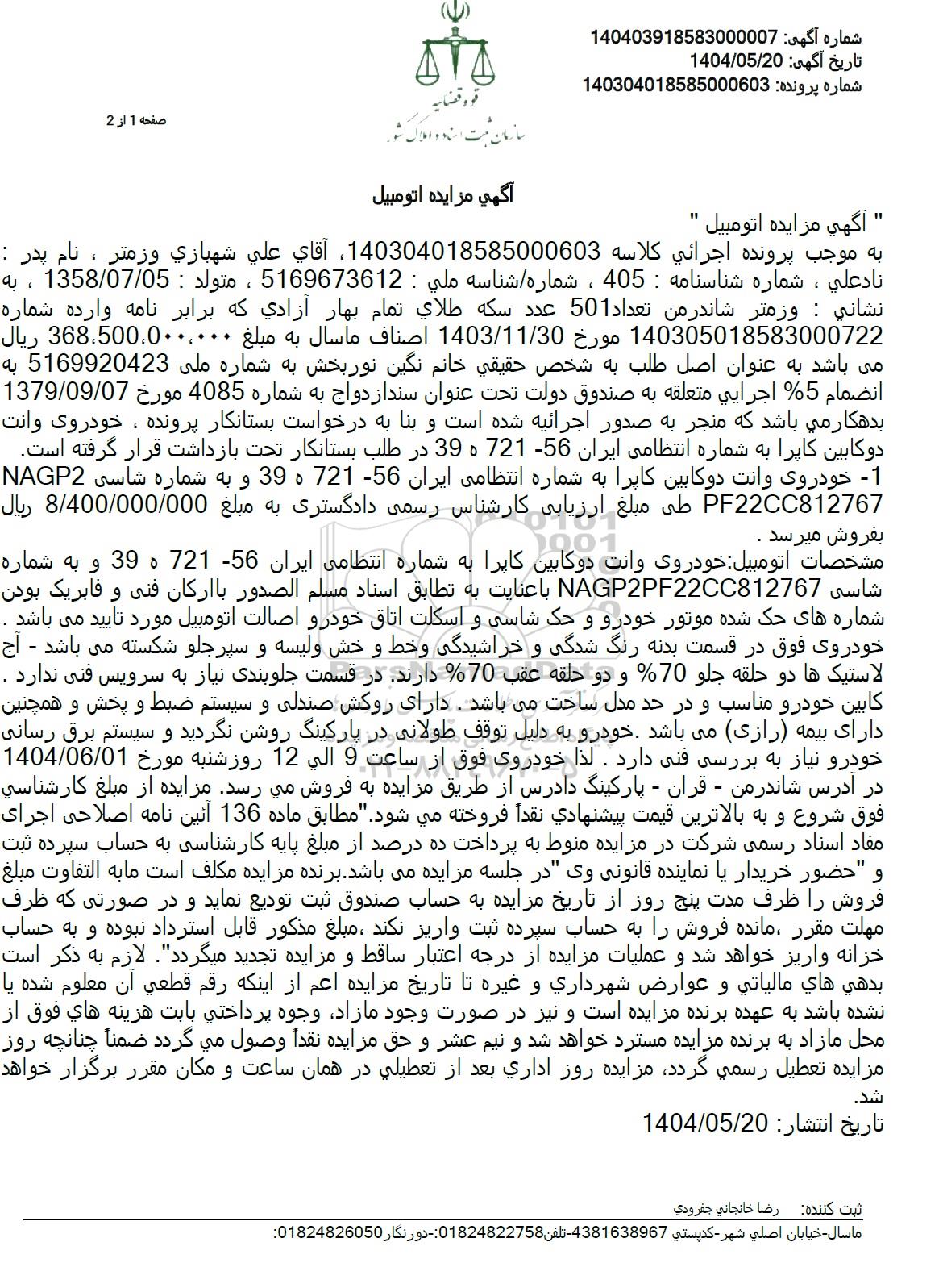 موضوع مزایده : یک دستگاه خودروی وانت دوکابین کاپرا به ارزش 8.400.000.000 ریال