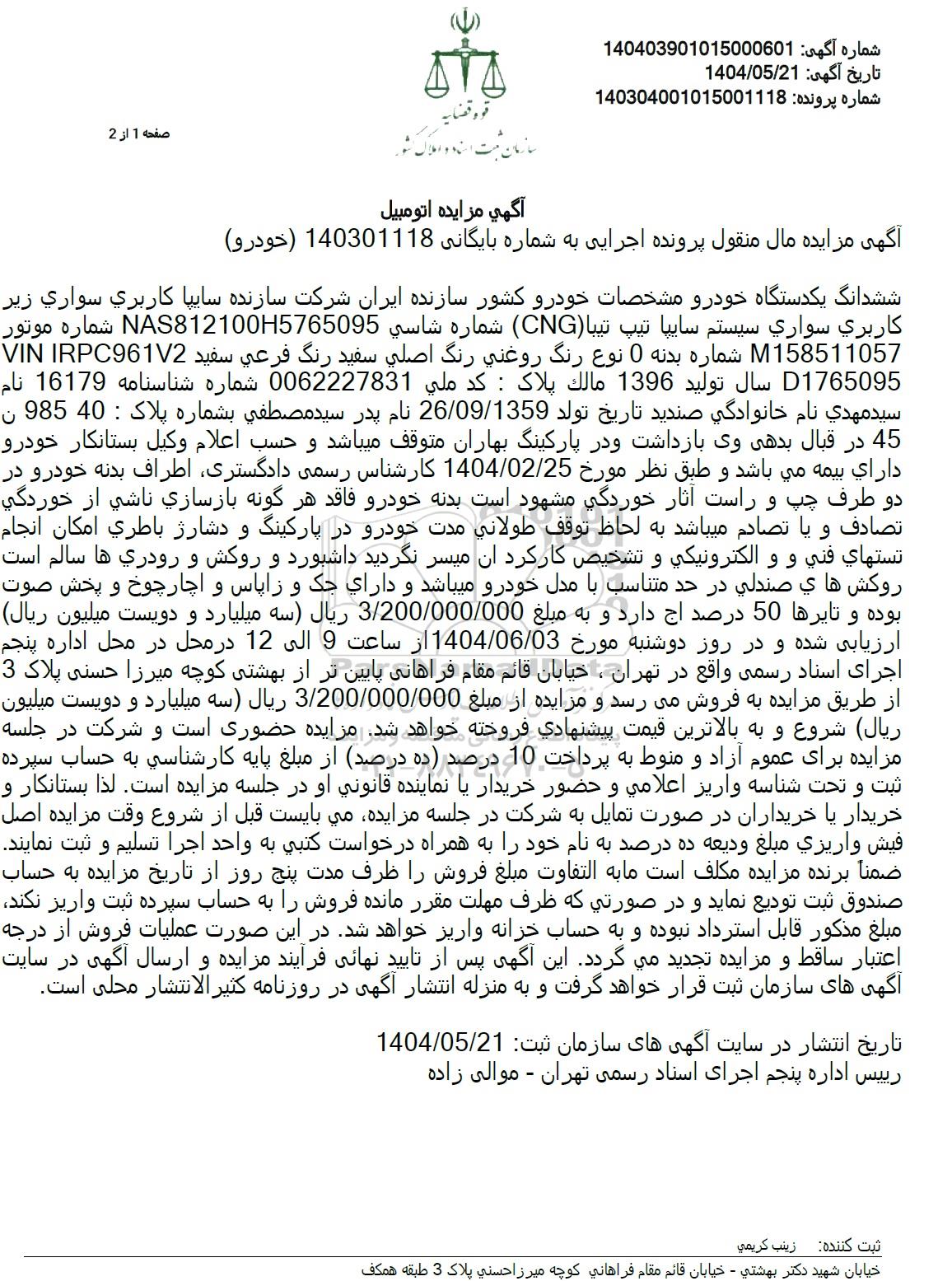 مزایده ششدانگ یک دستگاه خودرو سایپا تیپ تیبا کلاسه 140301118