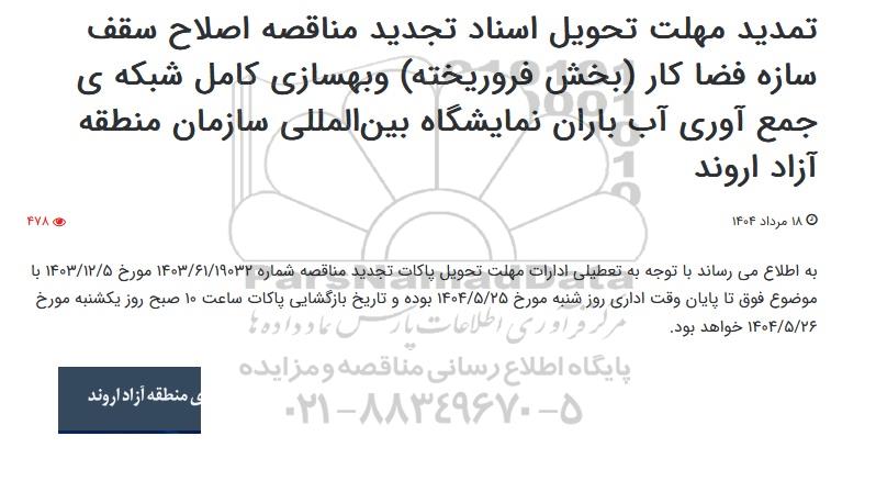 تمدید مهلت تحویل اسناد تجدید مناقصه اصلاح سقف سازه فضا کار (بخش فروریخته) و بهسازی کامل شبکه ی جمع آوری آب باران نمایشگاه بین المللی سازمان منطقه آزاد اروند