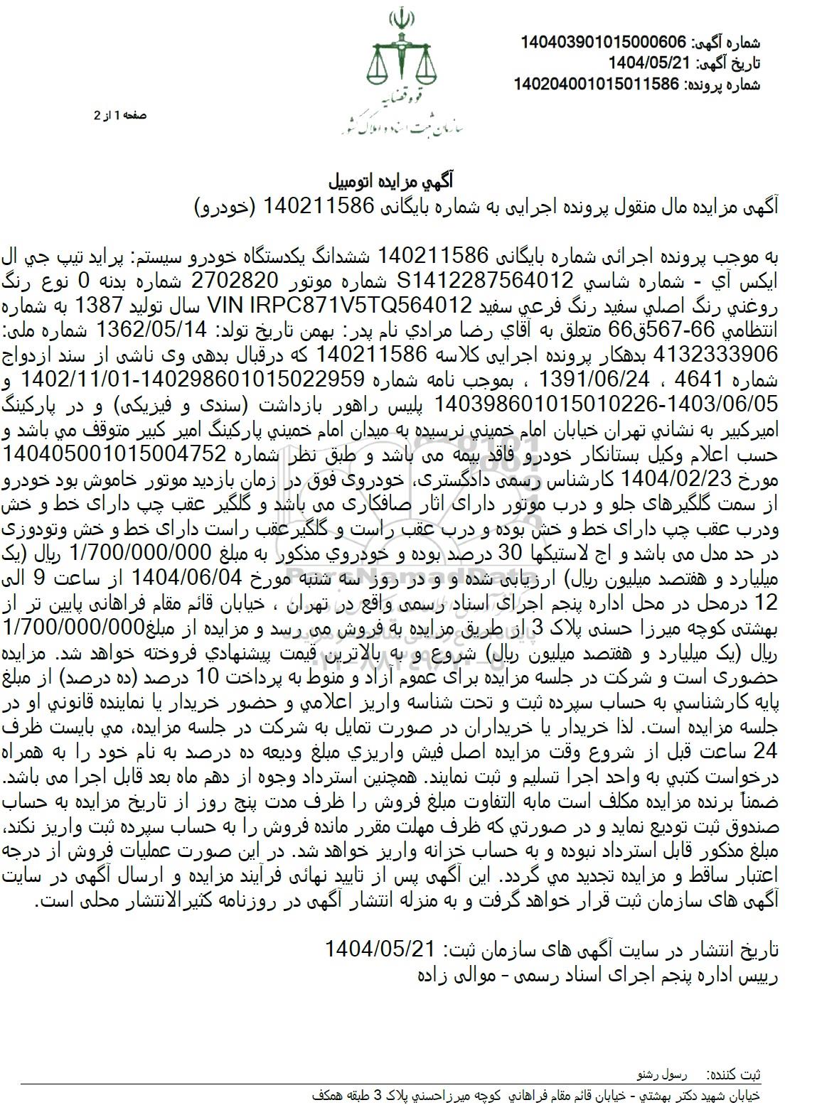 مزایده یکدستگاه خودرو پراید تیپ جی ال ایکس آی رنگ سفید مدل 1387, مزایده یکدستگاه خودرو پراید تیپ جی ال ایکس آی رنگ سفید مدل 1387