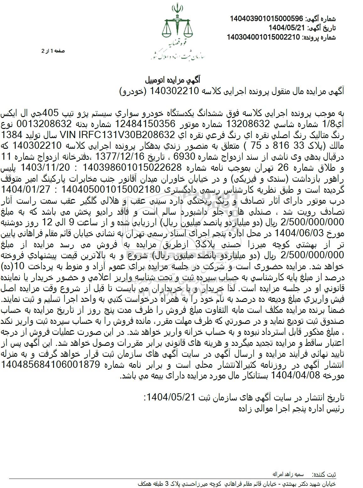 موضوع مزایده : یک دستگاه خودروی سواری سیستم پژو 405 جی ال ایکس مدل 1384 به رنگ نقره ای متالیک به ارزش 2.500.000.000 ریال