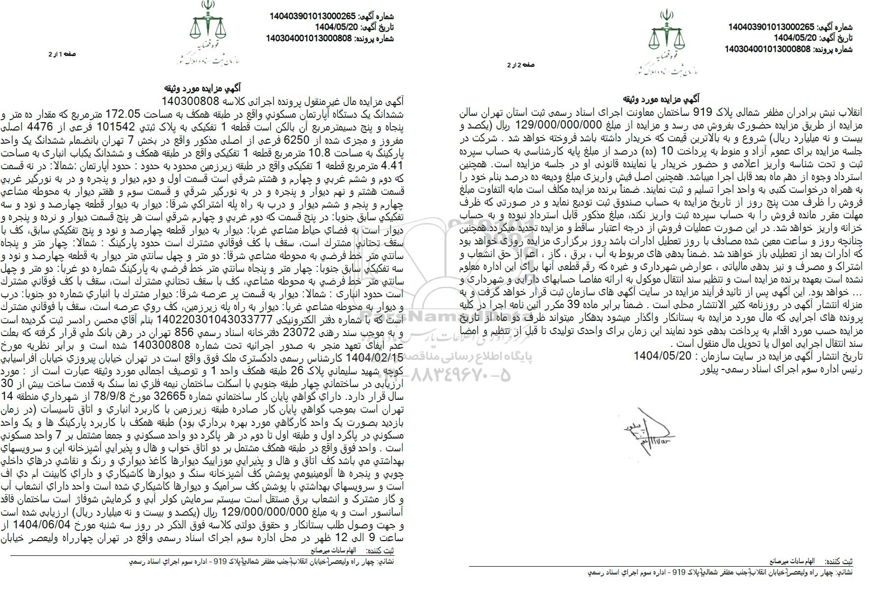 موضوع مزایده: ششدانگ یک دستگاه آپارتمان مسکونی واقع در طبقه همکف به مساحت 172.05 مترمربع به پلاک ثبتی 101542 فرعی از 4476 اصلی مفروز و مجزی شده از 6250 فرعی از اصلی مذکور واقع در بخش 7 تهران به مبلغ 129.000.000.000 ریال