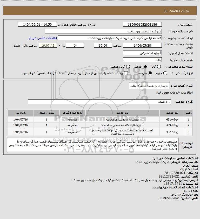 استعلام بازسازی و بهسازی مرکز بناب, استعلام بازسازی و بهسازی مرکز بناب