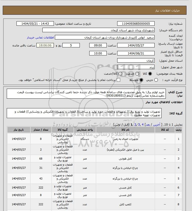 توضیحات خریدار:خرید لوازم برق: به دلیل محدودیت های سامانه همه موارد ذکر نشده حتما تامین کنندگان براساس لیست پیوست قیمت دهیدشماره تماس جهت ارتباط 09301809313