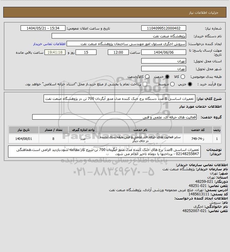شرح کلی نیاز: تعمیرات اساسی 8 عدد دستگاه برج خنک کننده مدل مدور آبگردان 700 تن در پژوهشگاه صنعت نفت