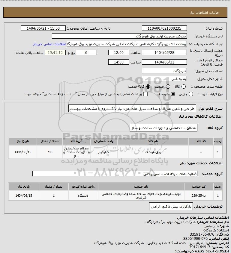 | 1 | -- | ورق فولادی | کیلوگرم | مصالح ساختمانی و ملزومات ساخت و ساز | 700 | 1404/06/15 |