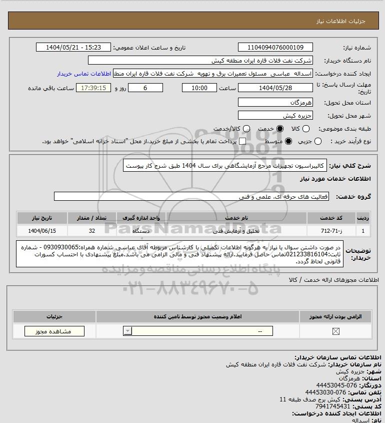 شرح کلی نیاز: کالیبراسیون تجهیزات مرجع آزمایشگاهی برای سال 1404 طبق شرح کار پیوست