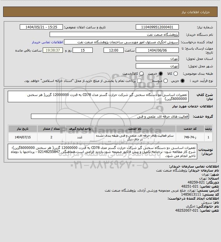 توضیحات خریدار:تعمیرات اساسی دو دستگاه سختی گیر شرکت حرارت گستر مدل CD78 به قدرت 12000000 گرین( هر سختی 6000000گرین)-شرح کار مطالعه شود- نرخنامه تکمیل و پیش فاکتور ضمیمه شود،بازدید الزامی است،هماهنگی 02148255847 - پرداختها با دوماه تاخیر انجام می شود.