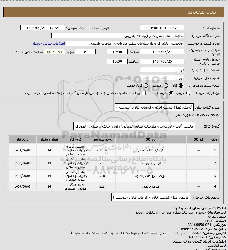 توضیحات خریدار:گرمکن غذا ( لیست اقلام و الزامات کالا به پیوست )