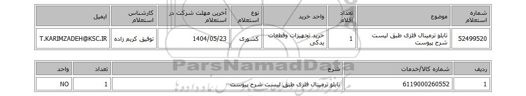 52499520تابلو ترمینال فلزی طبق لیست شرح پیوست1خرید تجهیزات وقطعات یدکیکشوری1404/05/23توفیق کریم زادهT.KARIMZADEH@KSC.IR