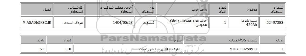 52497383ست باتری 420Ah1خرید مواد مصرفی و اقلام عمومیکشوری1404/05/23مزدک اسدیM.ASADI@KSC.IR