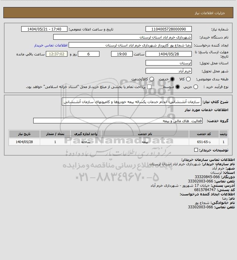 شرح کلی نیاز: سازمان آتشنشانی- انجام خدمات یکساله بیمه خودروها و کامیونهای سازمان آتشنشانی