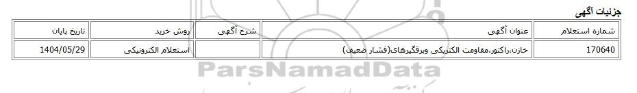 170640خازن،راکتور،مقاومت الکتریکی وبرقگیرهای(فشار ضعیف)استعلام الکترونیکی1404/05/29