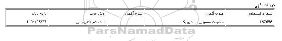 | 167656 | مقاومت معمولی ، الکترونیک | استعلام الکترونیکی | 1404/05/27 |