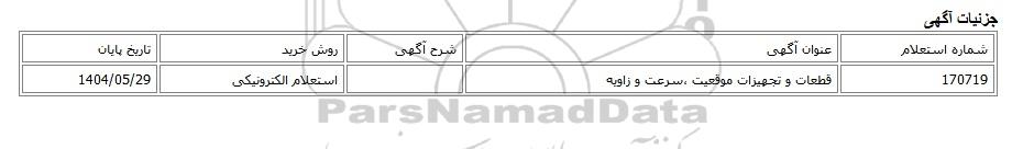 | 170719 | قطعات و تجهیزات موقعیت ،سرعت و زاویه | استعلام الکترونیکی | 1404/05/29 |