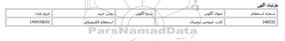 | 168232 | کارت خروجی دیجیتال | استعلام الکترونیکی | 1404/06/01 |