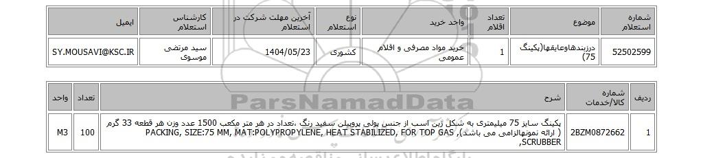 | 52502599 | درزبندهاوعایقها(پکینگ 75) | 1 | خرید مواد مصرفی و اقلام عمومی | کشوری | 1404/05/23 | سید مرتضی موسوی | SY.MOUSAVI@KSC.IR |
