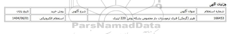 | 166453 | هیتر (گرمکن) فنری ترموستات دار مخصوص بشکه روغن 220 لیتری | استعلام الکترونیکی | 1404/06/01 |