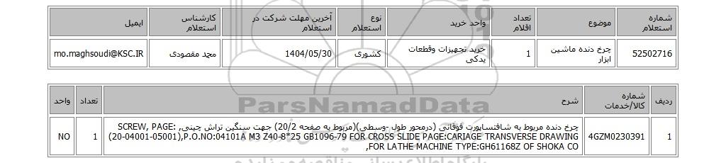 52502716چرخ دنده ماشین ابزار1خرید تجهیزات وقطعات یدکیکشوری1404/05/30محمد مقصودیmo.maghsoudi@KSC.IR