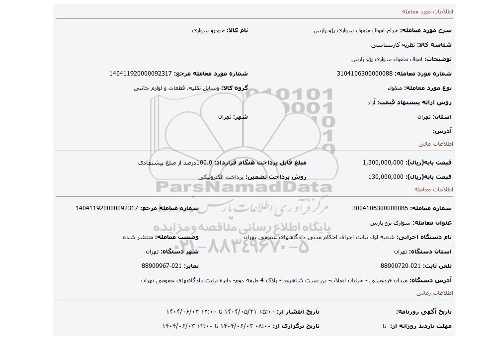 | شرح مورد معامله: حراج اموال منقول سواری پژو پارس | نام کالا: خودرو سواری | |