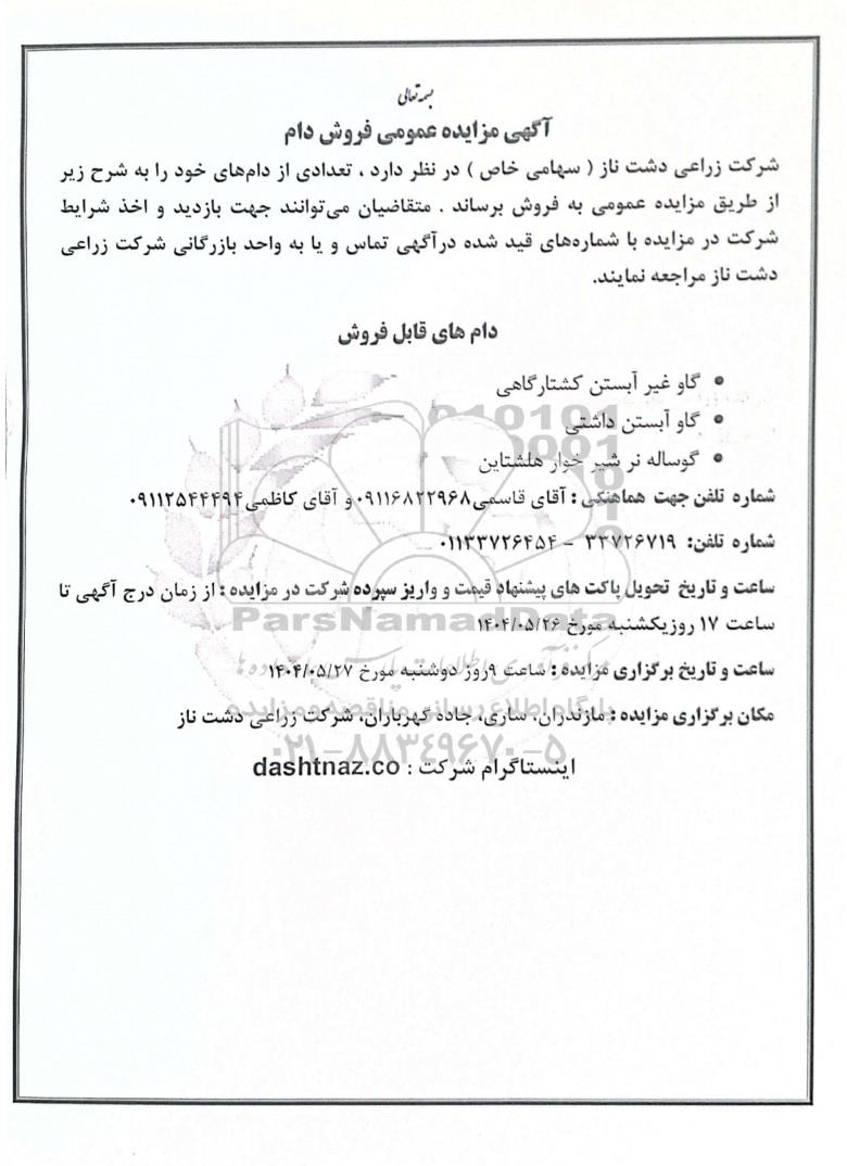 شرکت زراعی دشت ناز (سهامی خاص) در نظر دارد، تعدادی از دام های خود را به شرح زیر از طریق مزایده‌ عمومی به فروش برساند. متقاضیان می‌ توانند جهت بازدید و اخذ شرایط شرکت در مزایده با شماره‌ های قید شده در آگهی تماس و یا به واحد بازرگانی شرکت زراعی دشت ناز به آدرس زیر مراجعه نمایند.
