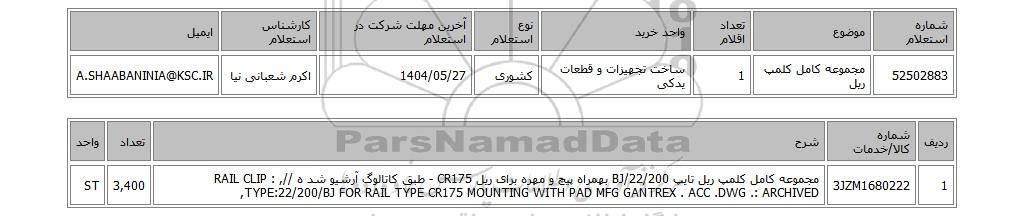 | 52502883 | مجموعه کامل کلمپ ریل | 1 | ساخت تجهیزات و قطعات یدکی | کشوری | 1404/05/27 | اکرم شعبانی نیا | A.SHAABANINIA@KSC.IR |